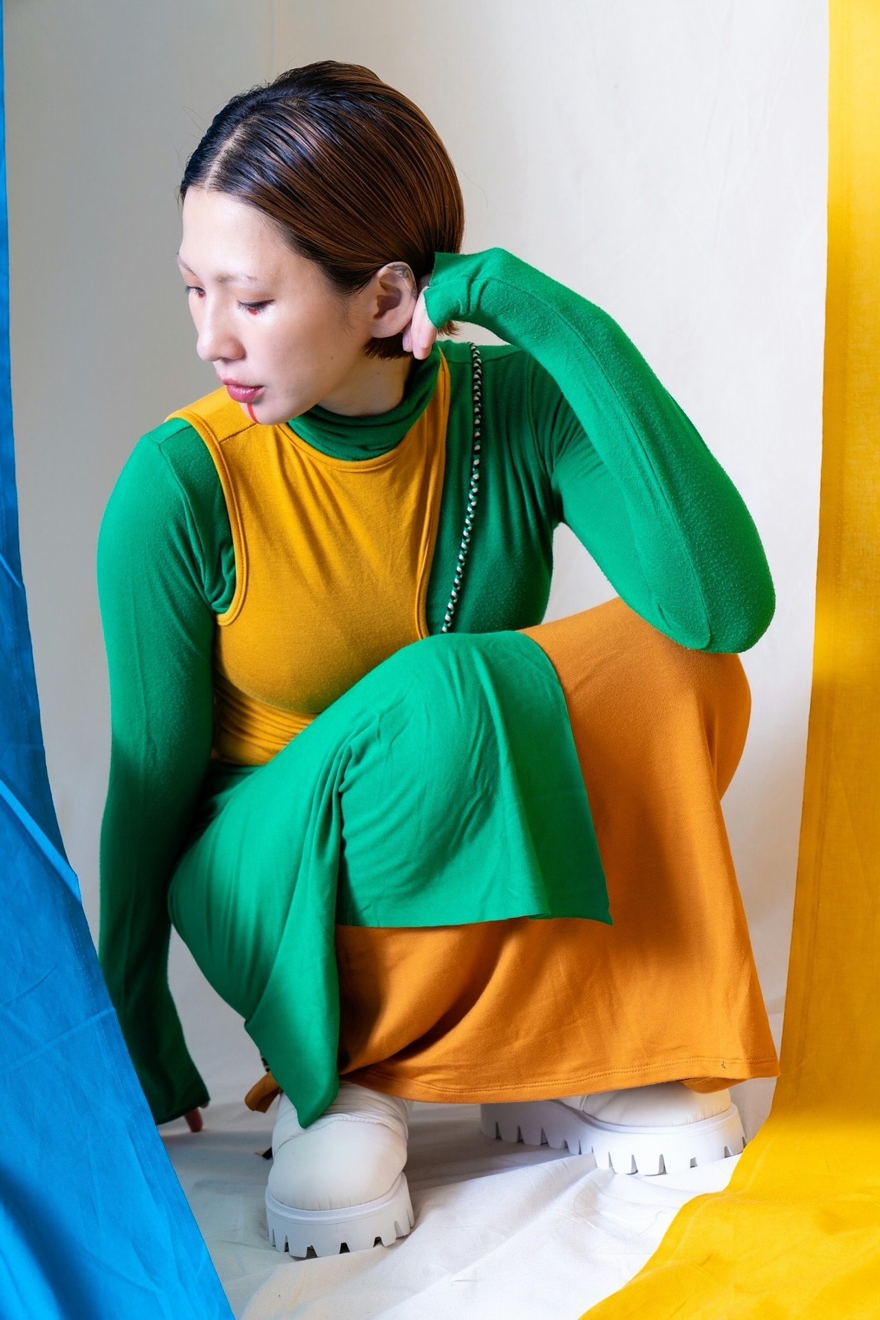 シャツやロングスリーブのものとレイヤードしたコーディネートもとてもおすすめで、スタイリングのアクセントになってくれる1着です。